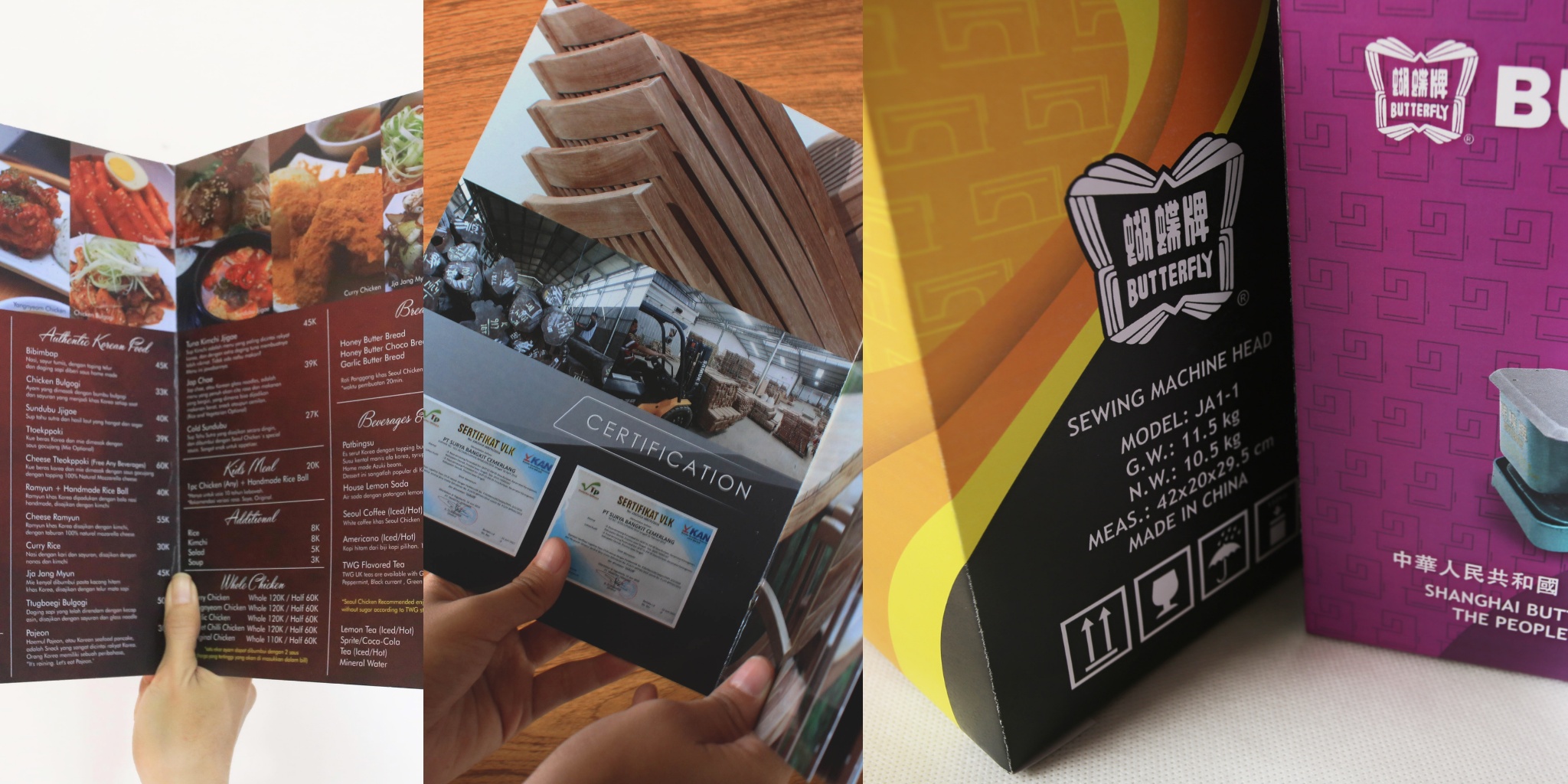 Poster, flyer, brosur, cover, annual report, buku tahunan, katalog produk, buku panduan, buku panduan peserta, voucher, id card, kalender meja, kalender dinding, buku menu, lembar menu, katalog menu, promotional kit, flag chain, x banner, souvenir bag, totte bag, souvenir seminar, map, envelope, kop surat dan berbagai materi cetak lain serahkan kepada kami.